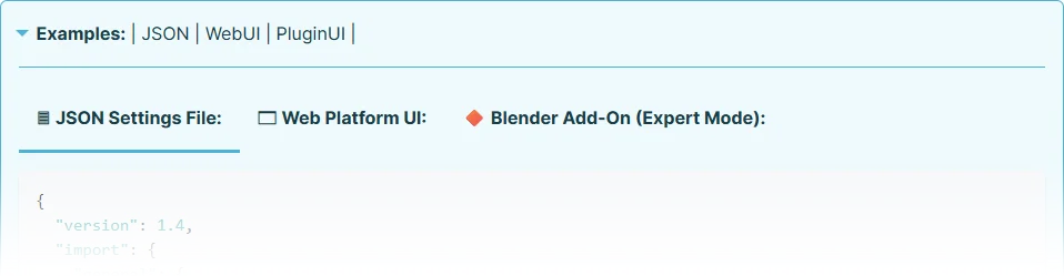 A Settings Preset Config file is needed to perform any changes to a 3D asset. This is a JSON-formatted text file with a specific layout, containing settings that can be edited as needed.