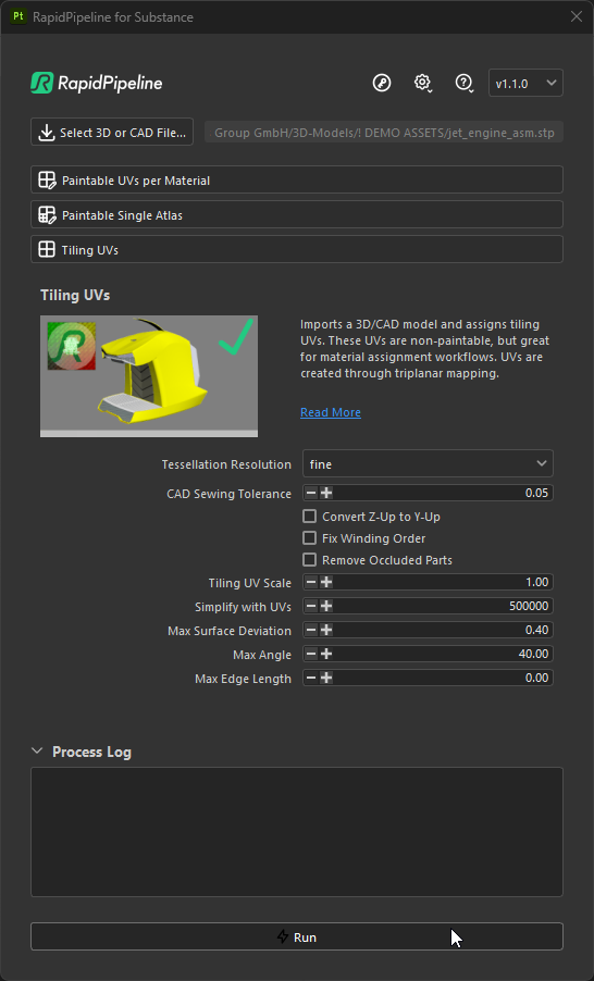This action imports a 3D model and assigns tiling UVs. The UVs are created using triplanar mapping, great for assigning materials with tiled textures.
